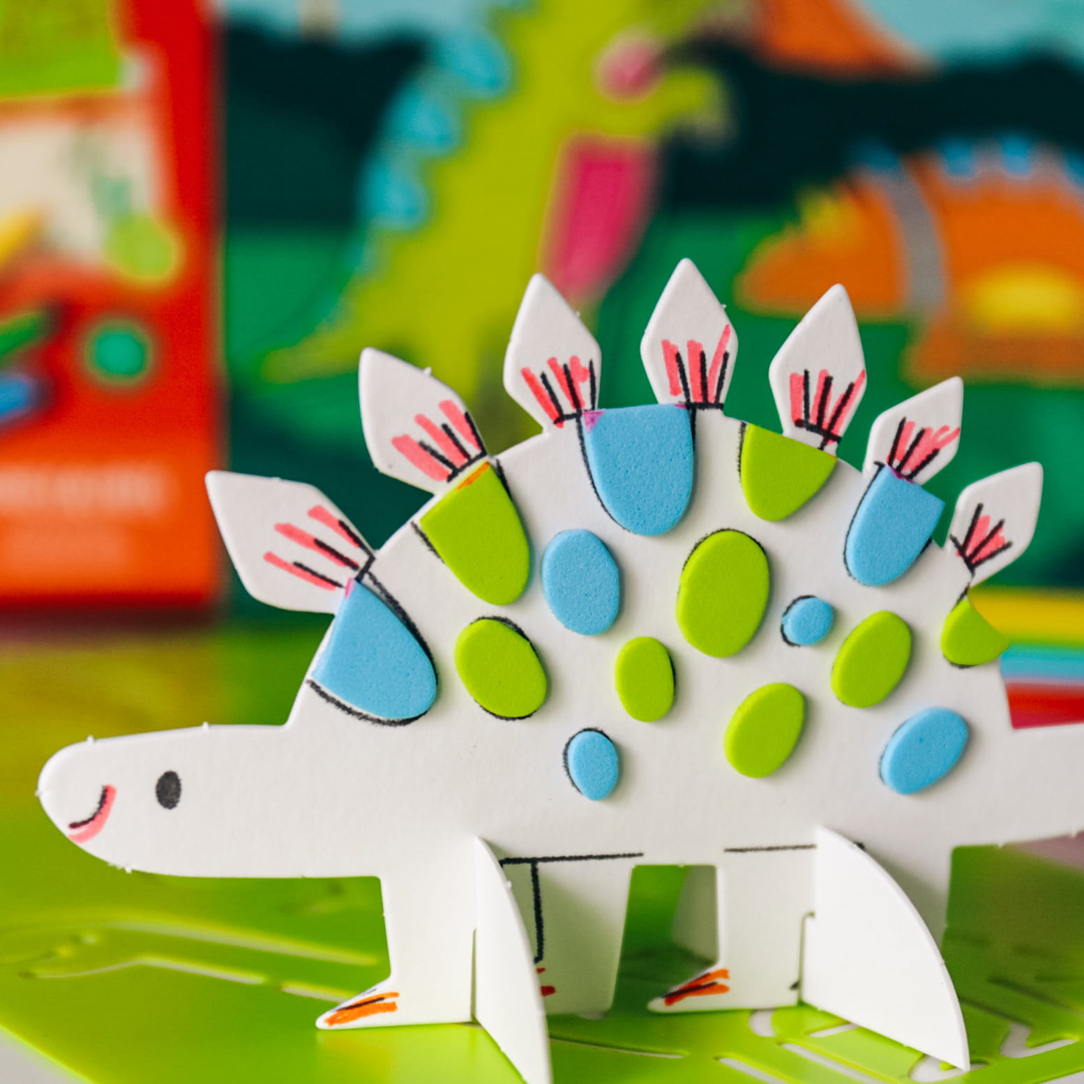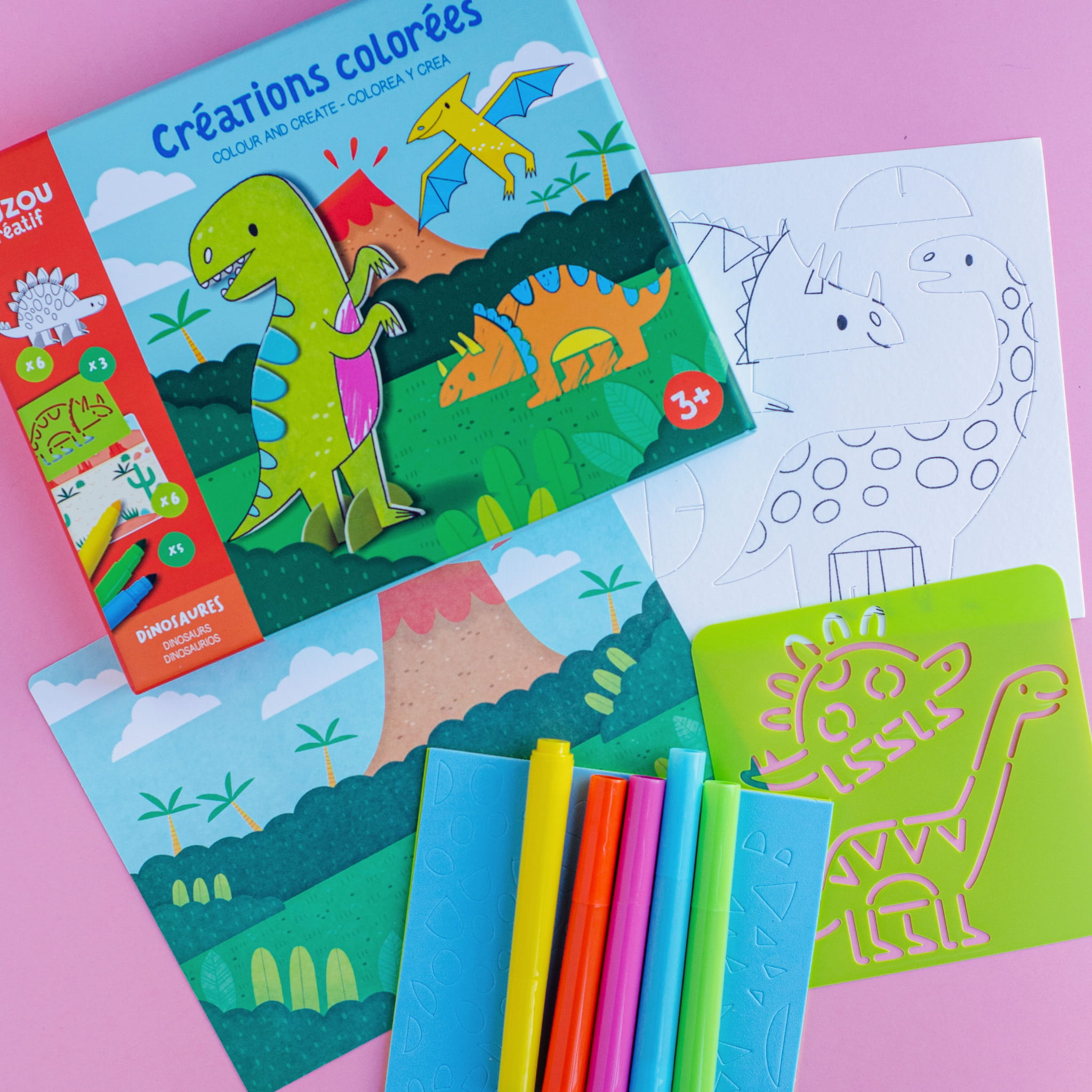 Zestaw kreatywne Dinozaury od Auzou. W zestawie znajduje się : 5 kolorowych flamastrów, 3 tablice z szablonami dinozaurów, 6 ozdób do animacji, 6 papierowych zabawek do własnoręcznego pokolorowania oraz 70 naklejek piankowych. Świetna, kreatywna zabawa gwarantowana.