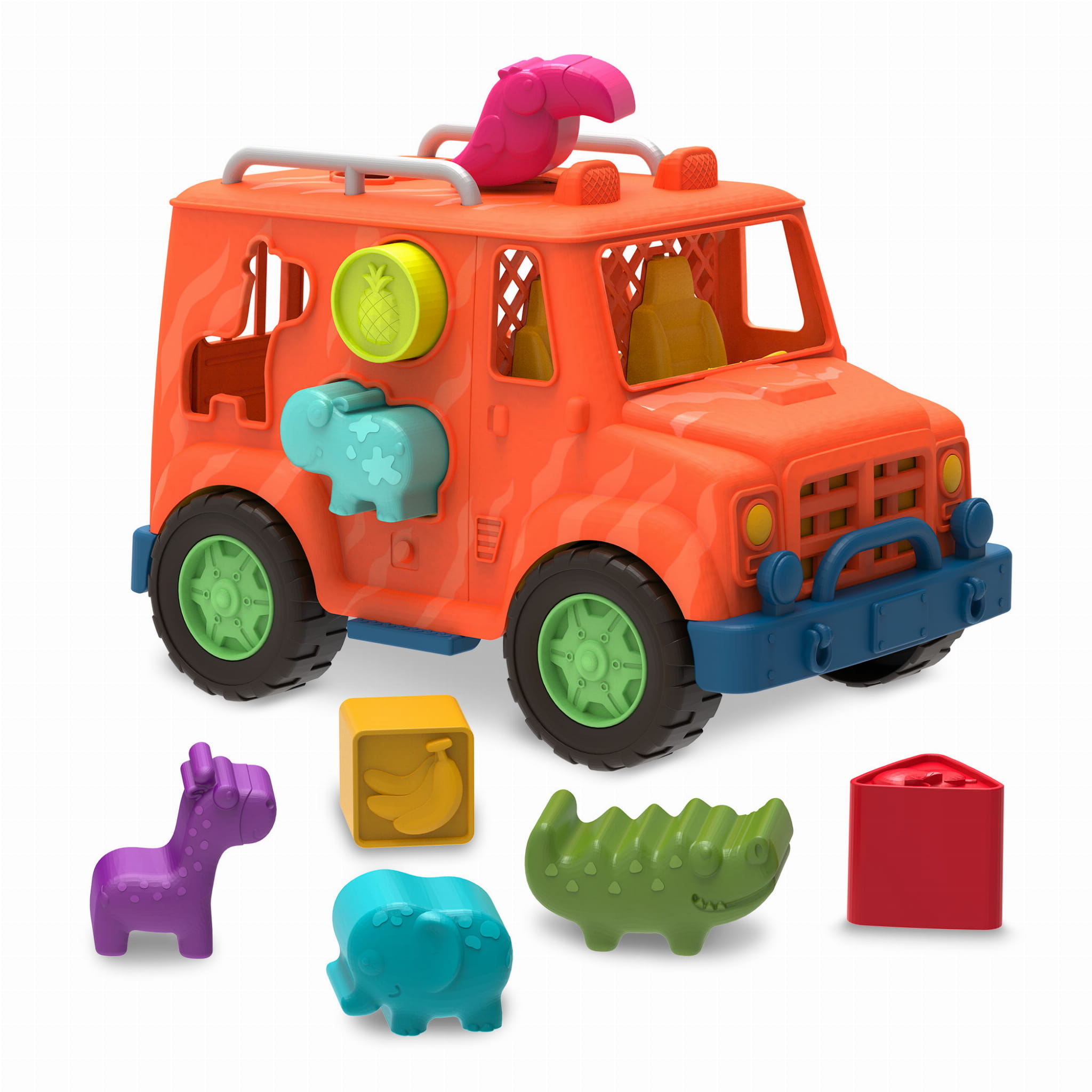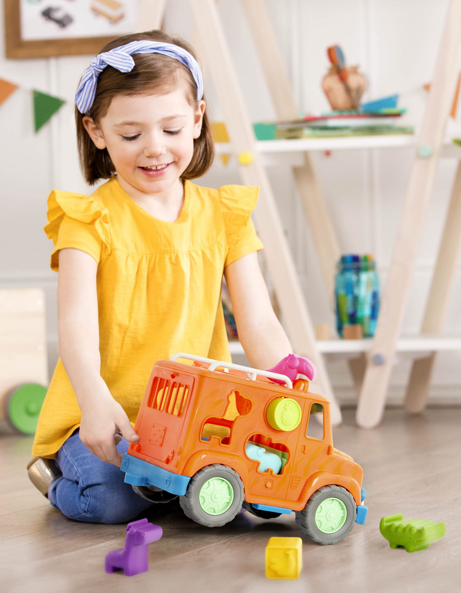 Oprócz tradycyjnej funkcji pojazdu, zabawka stanowi równocześnie sorter, który dostarczy mnóstwo frajdy. Dodatkową atrakcję stanowi uchylana klapa tylna samochodu.