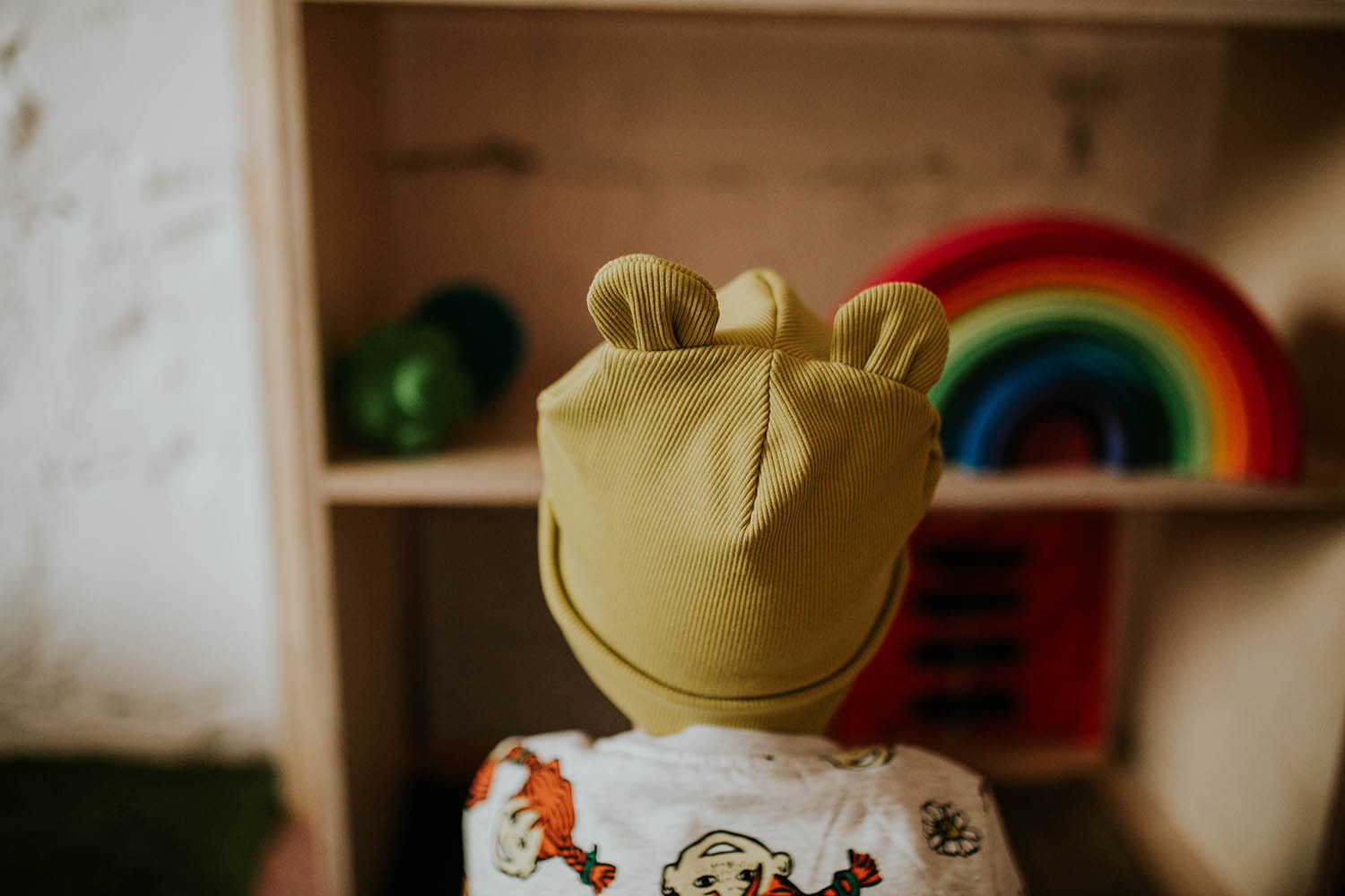 Czapka Puchatka gruba z podwójnej warstwy dzianiny prążkowanej rozmiar XS - 0-2 miesiące.