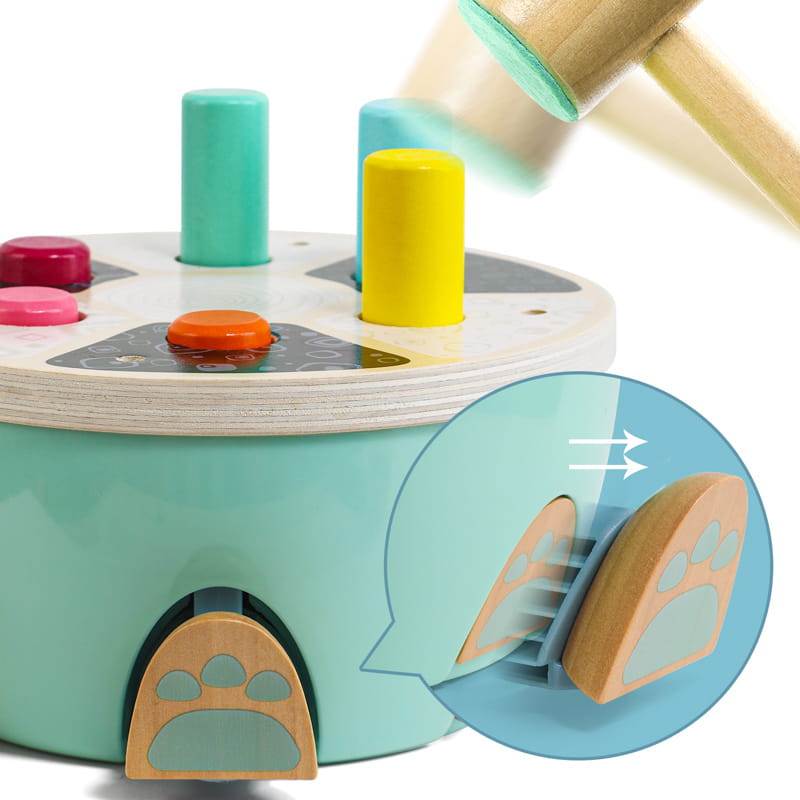 Na szczęście młotek jest poręczny dla małych dziecięcych rączek, a jego powierzchnia została pokryta filcem, który tłumi odgłosy uderzeń.
