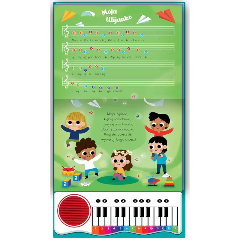 Kolorowe, oznaczone numerami nutki odpowiadając kolorom i numerom klawiszy pianinka, co ułatwia grę na instrumencie. Z tą książką dziecko nauczy się grać popularne i lubiane piosenki.