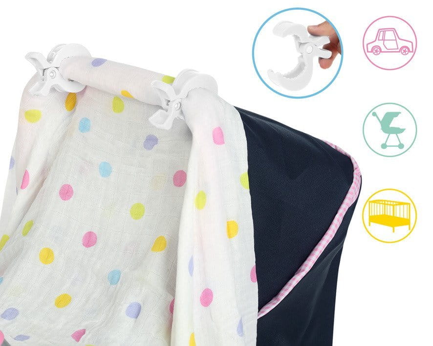 Uniwersalne klamry do wózka posłużą idealnie zarówno przy wózku, nosidełku czy łóżeczku. Pozwolą one zamocować pieluszkę dziecięcą (tetrową, muślinową, bambusową czy inną) w celu ochrony dziecka przed słońcem, światłem lub chłodem.