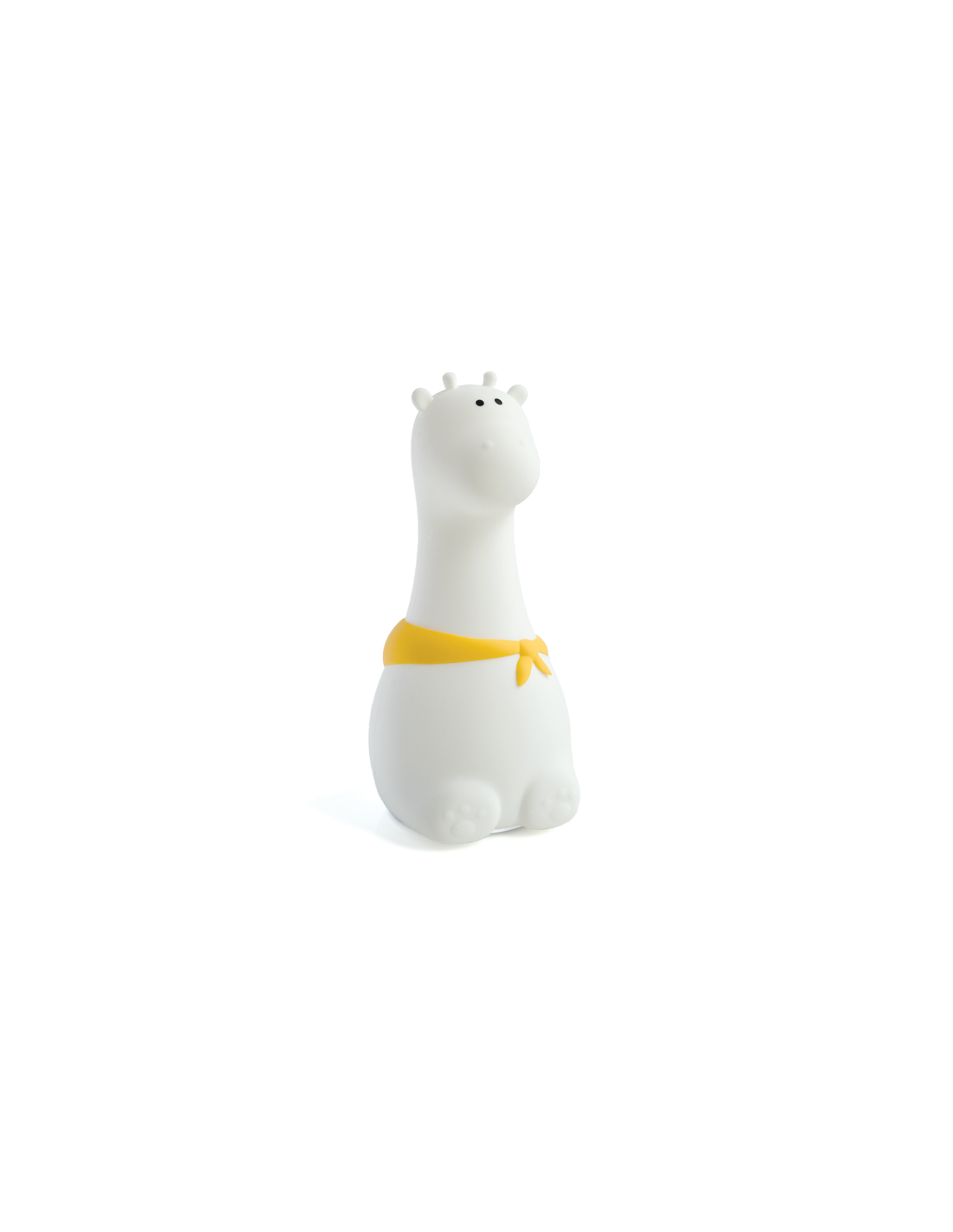 Lampka ŻYRAFA Rabbit&Friends ma charakterystyczny i zabawny kształt małej siedzącej żyrafy z rożkami i sterczącymi uszkami, okrągłymi oczkami, miłym pyszczku i długiej przyozdobionej chustą szyi.