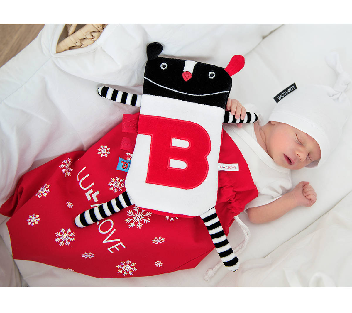 - kontrastowe kolory (biel, czerń, czerwień) stymulujące wzrok niemowlaka,
