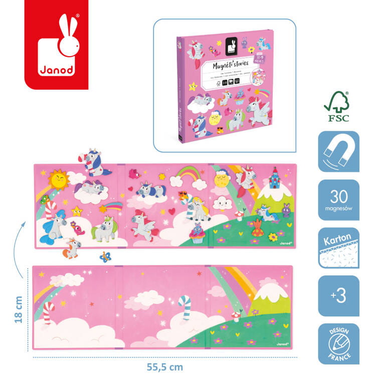 Magnetyczne układanki Jednorożce z linii Magneti'stories francuskiej marki Janod zawierają 30 magnesów –baśniowych jednorożców, owadów, gwiazd, komet itp., które stanowią części składowe do stworzenia oryginalnej ilustracji na rozkładanej potrójnej planszy. Magnesy pozwalają na układanie wymyślonych przez siebie opowieści, których bohaterami są jednorożce.