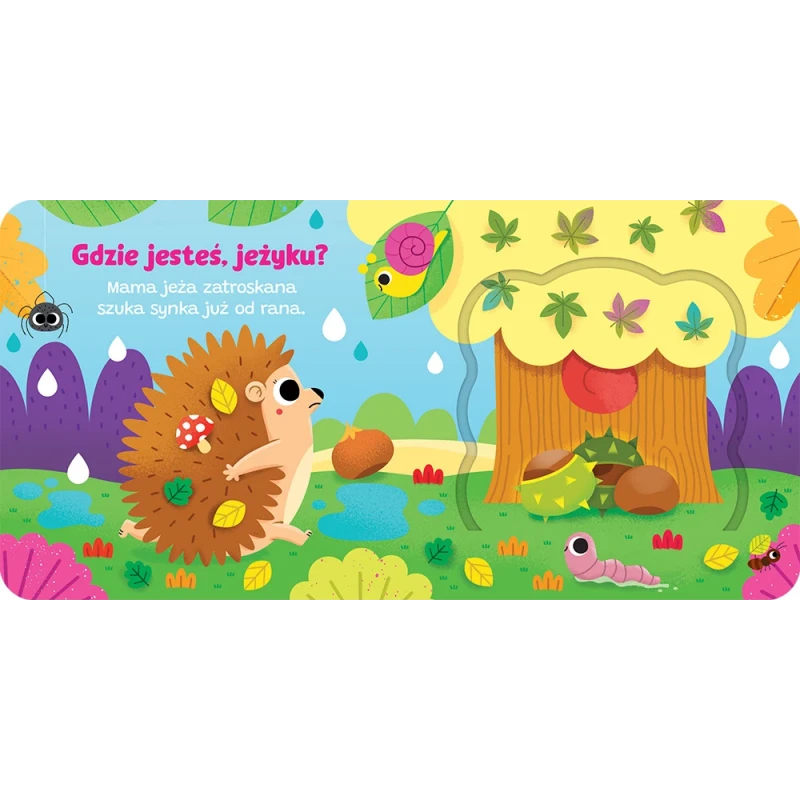 Zabawa tą książką polega na otwieraniu okienek, w których kryją się leśne zwierzęta: wiewiórka, kret, bóbr, pszczoły i mały jeż, którego po lesie szuka mama.