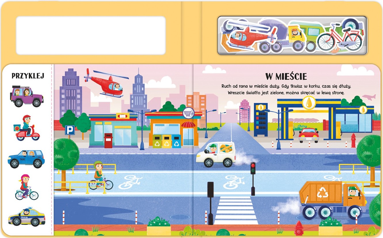 Magnesy dobrze przylegają do stron, są bezpieczne i można ich używać wielokrotnie. Dziecko komponuje strony, zmieniając miejsca przyklejenia magnesów. Z tą książką dziecko rozwija zmysły, utrwala nazwy pojazdów, a także ćwiczy pamięć i motorykę małą.