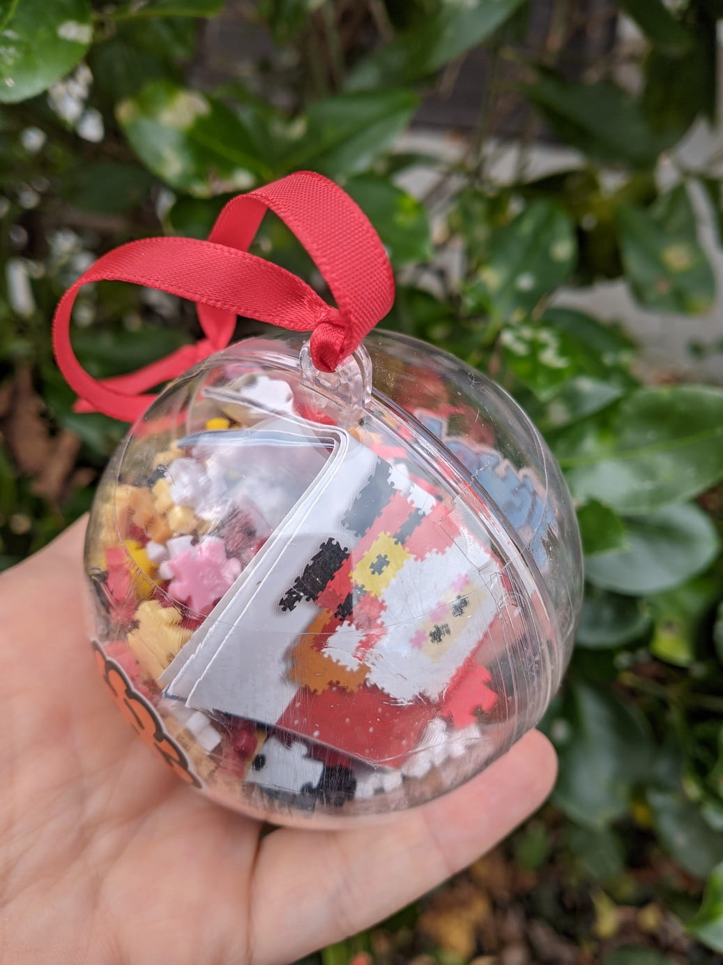Przezroczysta bombka, którą można powiesić na choince wypełniona jest co najmniej 150 precyzyjnie wyciętymi, puzzelkami pixelkami, z których można ułożyć bałwanka w kapeluszu, a potem ozdobić nim choinkę i dom.