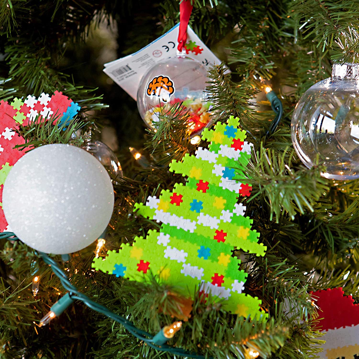 Przezroczysta bombka, którą można powiesić na choince wypełniona jest co najmniej 150 precyzyjnie wyciętymi, puzzelkami pixelkami, z których można ułożyć choinkę, a potem ozdobić nią choinkę i dom.