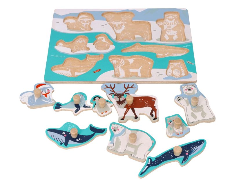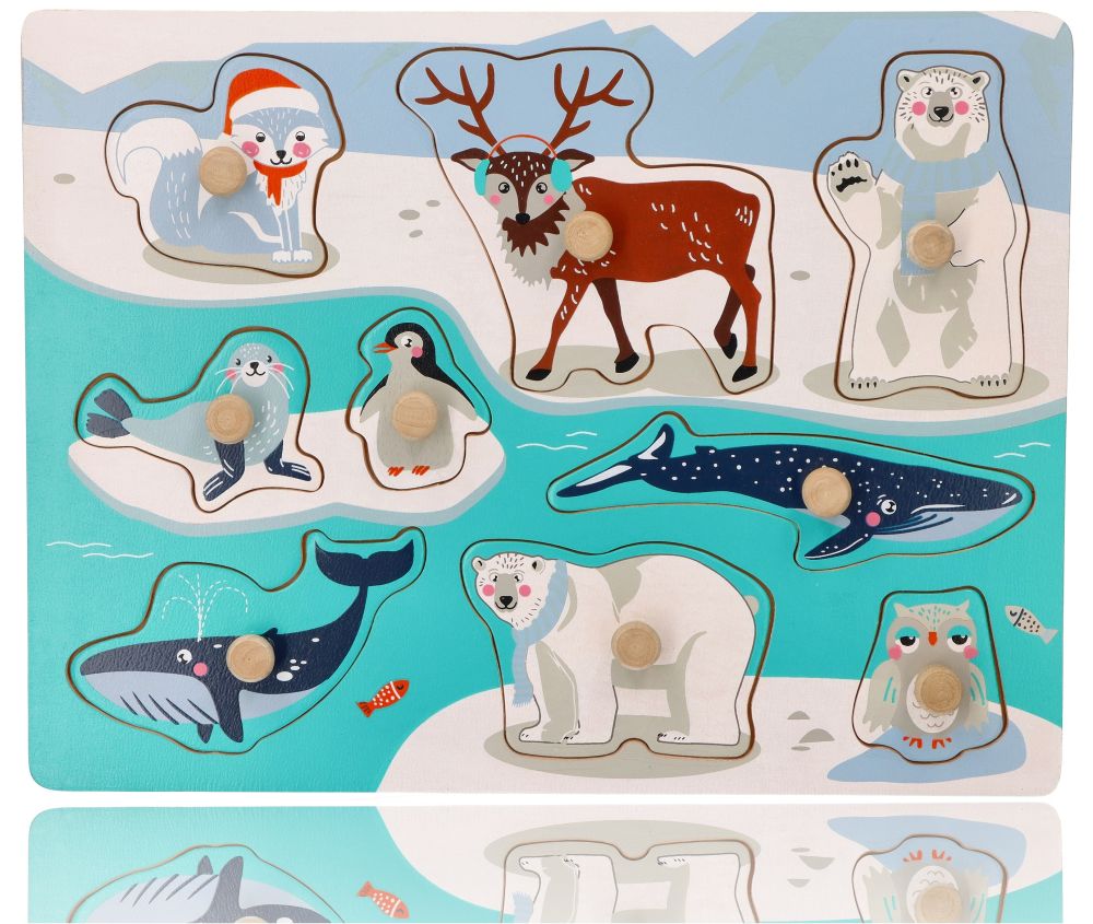 Klasyczna drewniana układanka z uchwytami przedstawiająca zwierzątka arktyczne , które w wyniku działalności człowieka zagrożone są wyginięciem.