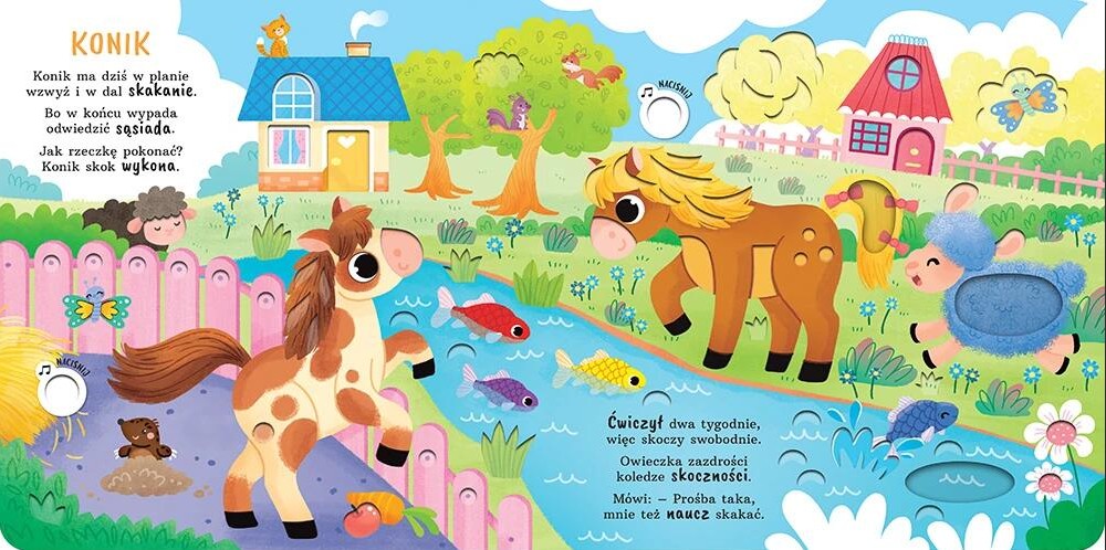 Posłuchaj odgłosów zwierząt oraz wierszyków, dotknij otworów i sprawdź, jakie rysunkowe niespodzianki kryją się na poszczególnych stronach.