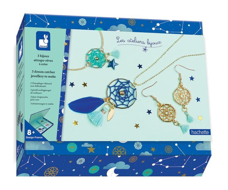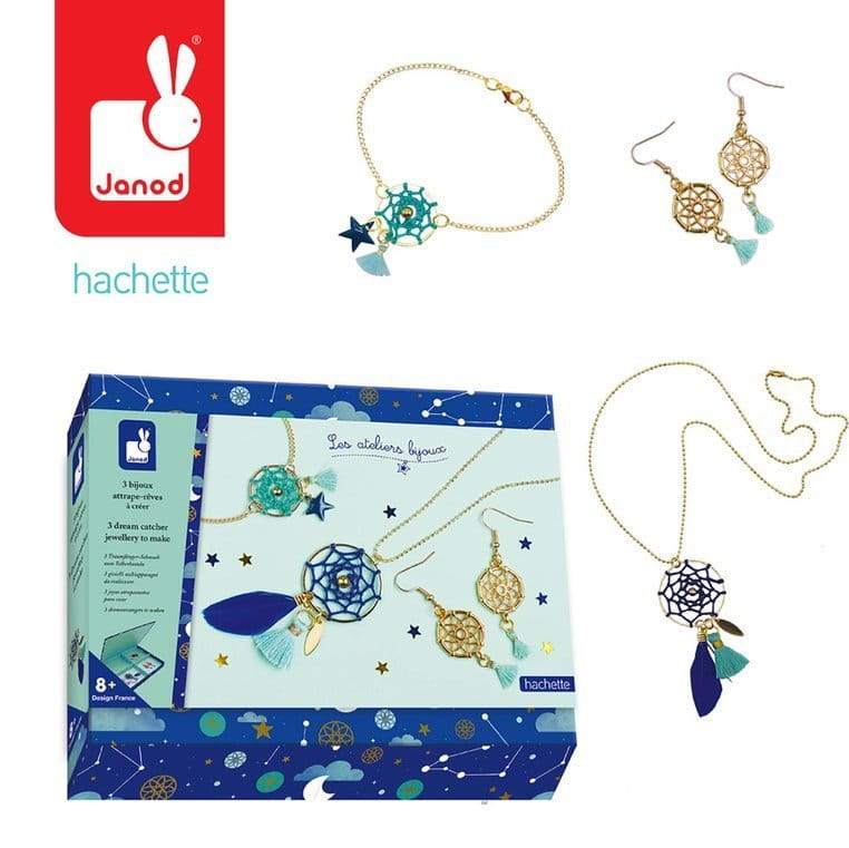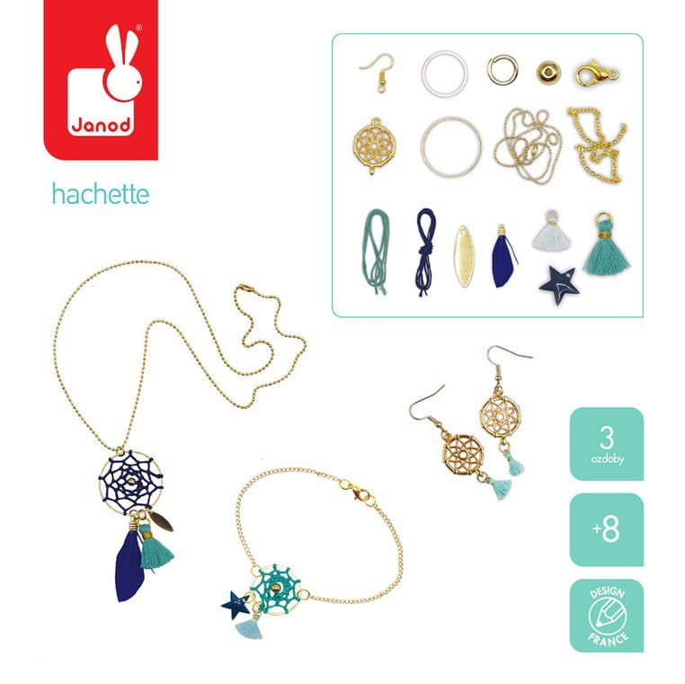 Zestaw do tworzenia biżuterii Łapacze snów francuskiej marki JANOD pozwoli stworzyć łącznie 3 sztuki biżuterii: bransoletkę, naszyjnik i kolczyki.