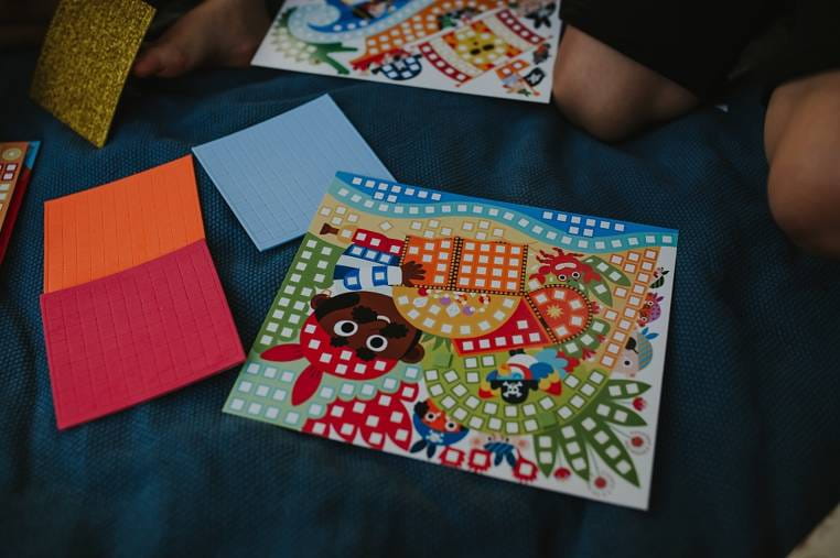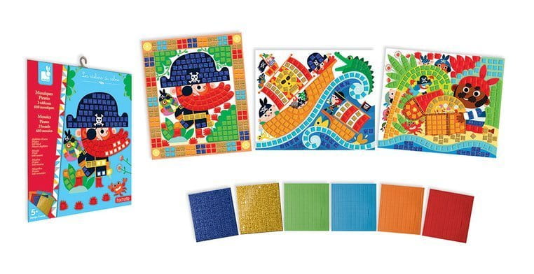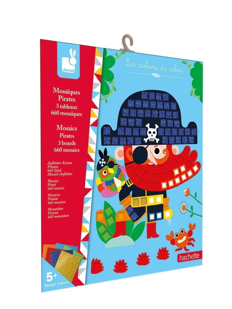 Zestaw kreatywny Mozaika Piraci francuskiej marki JANOD zawiera 3 kartonowe plansze-obrazki, które przedstawiają przygody piratów, m.in. sztorm na morzu i znalezienie skarbu na wyspie. Do ilustracji tych można – zarówno w sugerowanych miejscach, jak i dowolnie – przyklejać dołączone do zestawu drobne kwadratowe piankowe naklejki (ponad 700 sztuk!) w 6 różnych kolorach, w tym dwóch z efektem połysku (każdy na osobnym arkuszu). Naklejanie to dla dziecka długie godziny angażującej i jednocześnie uspokajającej, wyciszającej zabawy, a gotowe obrazki staną się wspaniałym elementem dekoracyjnym dziecięcego pokoju.