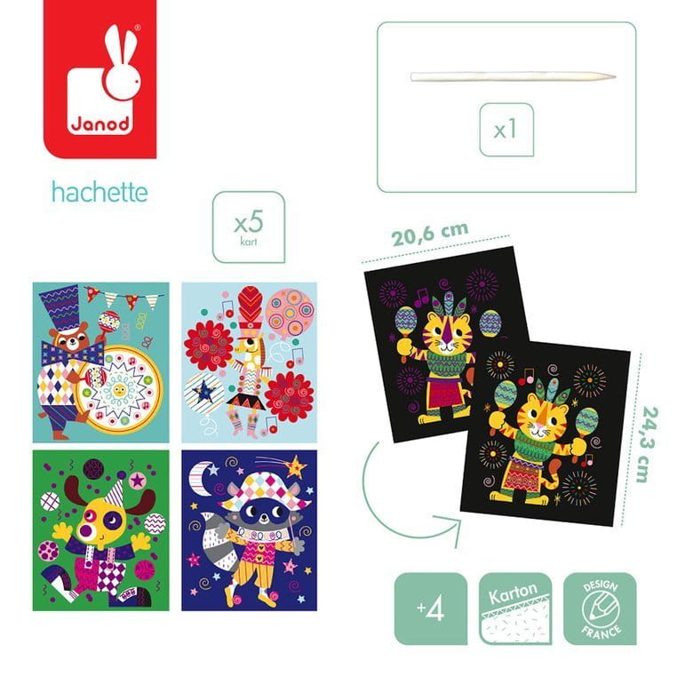 Zestaw kreatywny Do zdrapywania Graficzne zwierzątka francuskiej marki JANOD zawiera 5 plansz-obrazków z solidnego kartonu, przedstawiających zabawne i bajecznie kolorowe stworzenia w cyrkowych strojach: żyrafę, niedźwiadka, tygrysa, pieska i szopa.