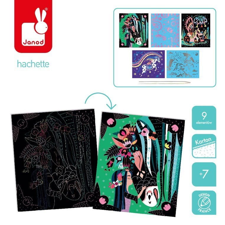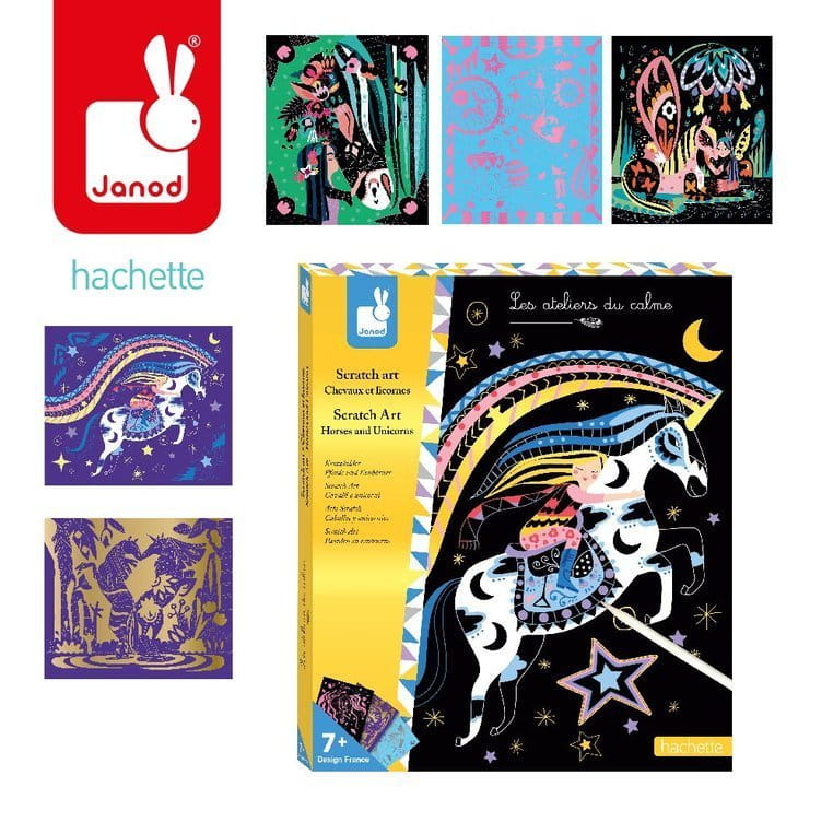 Zestaw kreatywny Do zdrapywania Konie i jednorożce francuskiej marki JANOD zawiera 8 plansz z solidnego kartonu, przedstawiających magiczne życie koni i jednorożców, m.in. podniebną podróż czy kąpiel w leśnym jeziorze. Obrazki są pokryte jednobarwną warstwą wierzchnią z konturami elementów, które ukazują się stopniowo w efekcie jej zdrapywania. Do zestawu dołączony jest plastikowy patyczek.