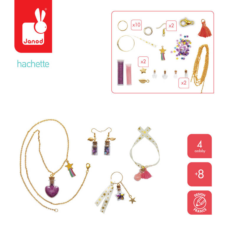 Zestaw kreatywny My jewellery box Eliksiry wróżek francuskiej marki JANOD pozwoli stworzyć łącznie 4 sztuki biżuterii: naszyjnik, bransoletkę, kolczyki i pierścionek – każdy z magiczną miksturą w miniaturowej buteleczce. W jego skład wchodzi 5 maleńkich zawieszek-butelek, zamykanych korkiem, w których znajdują się czarodziejskie gwiazdki lub brokat, wstążka w złote gwiazdki, elementy z metalu w kolorze złota: łańcuszek, obręcz pierścionka, haczyki do kolczyków oraz kilka drobnych zawieszek. W kilka chwil Twoje dziecko może stać się kreatywnym jubilerem! Projektowanie i tworzenie biżuterii to długie godziny angażującej i jednocześnie uspokajającej, wyciszającej zabawy, a po skończonej pracy powstałe dzieła mogą jeszcze długo służyć jako ozdoby lub podarunki dla bliskich. Do zestawu dołączona jest szczegółowa instrukcja jak wykonać poszczególne ozdoby.