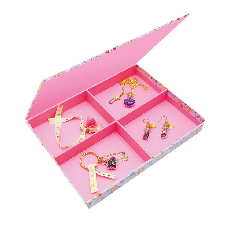 Zestaw zaprojektowano we Francji we współpracy z francuską grupą mediową i wydawniczą Hachette. Zapakowany jest w stylowe kartonowe pudełko z klapką i przegródkami. Idealnie sprawdzi się ono do przechowywania stworzonych świecidełek i innej dziewczęcej biżuterii! To doskonały pomysł na prezent!